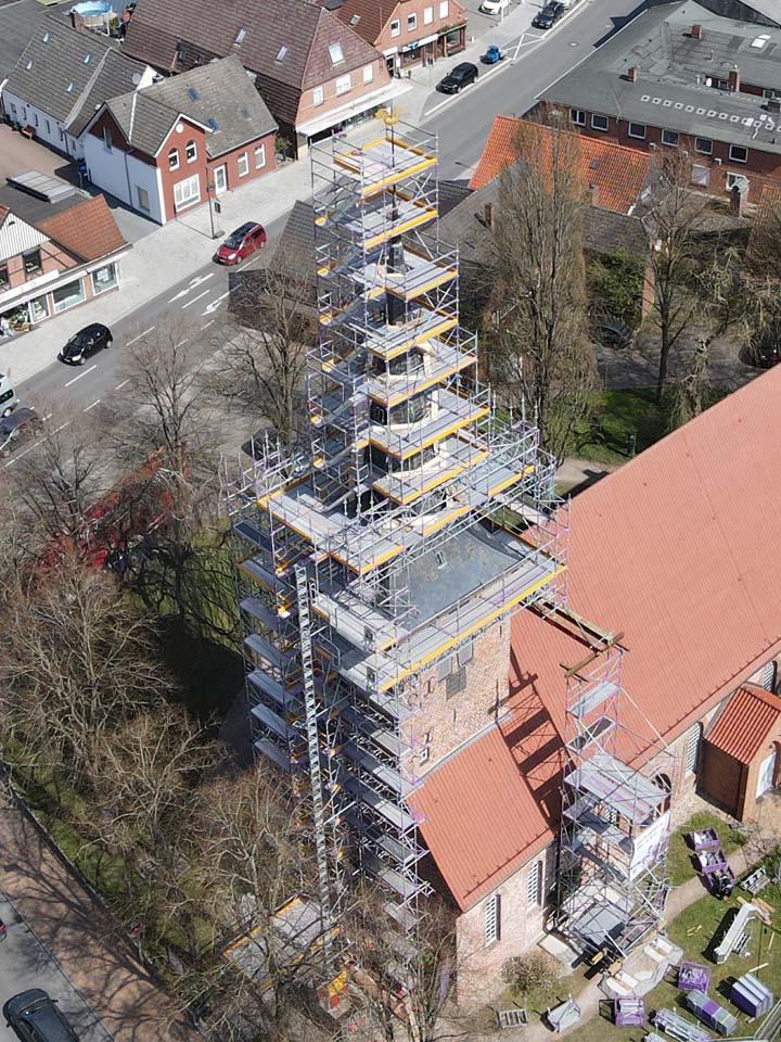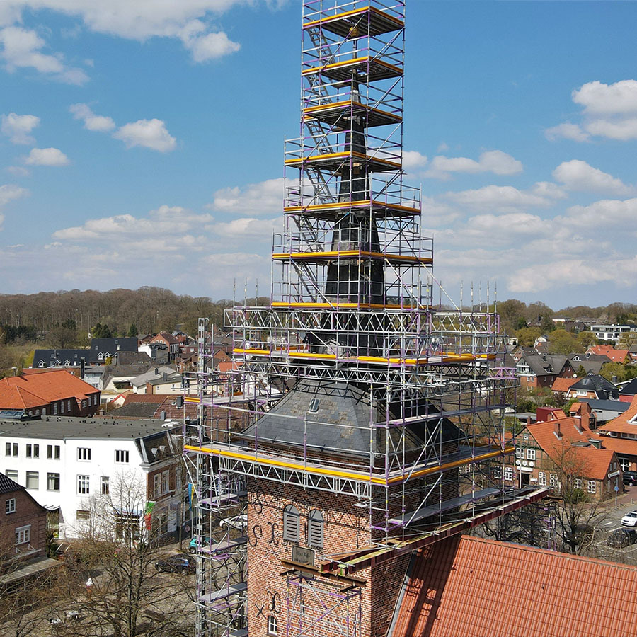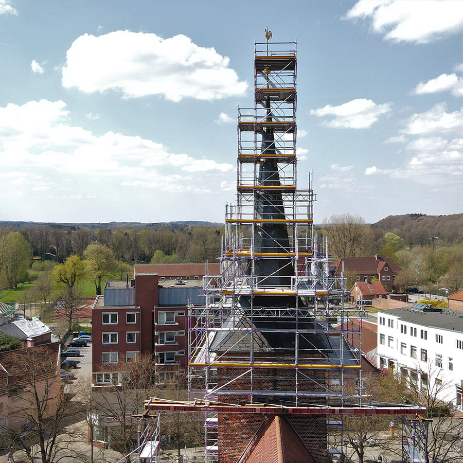Kirche Bad Bramstedt Projekt Details Auftraggeber:Ort: Bad Bramstedt Gerüstfläche:Bauzeit: 2022 Gerüstsystem: PERI UP EASY – Fassadengerüst, PERI UP FLEX – Modulgerüst